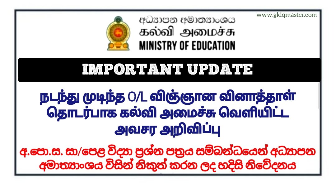 GCE.O/L Exam Science Question Paper Issue; Important Notice for Students