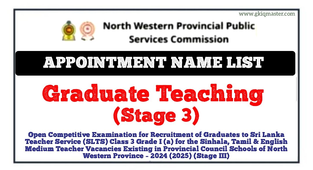 Open Competitive Examination for Recruitment of Graduates to Sri Lanka Teacher Service (SLTS) Class 3 Grade I (a) for the Sinhala, Tamil & English Medium Teacher Vacancies Existing in Provincial Council Schools of North Western Province – 2024 (2025) (Stage III)